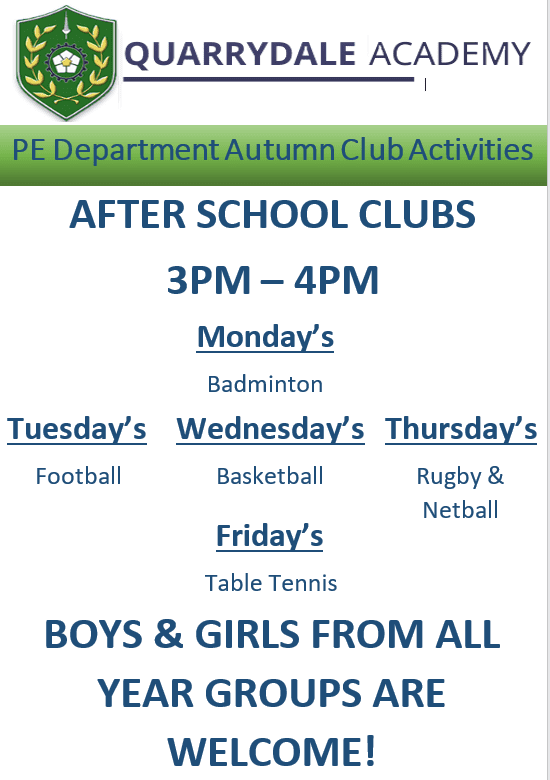 On an average week Quarrydale Academy offers a wide variety of different clubs for students to take part in. This offer encompasses all manner of different opportunities from study sessions and GCSE revision and sporting activities to Cartoon Club, Technology Club, F1 Club and Brilliant Club